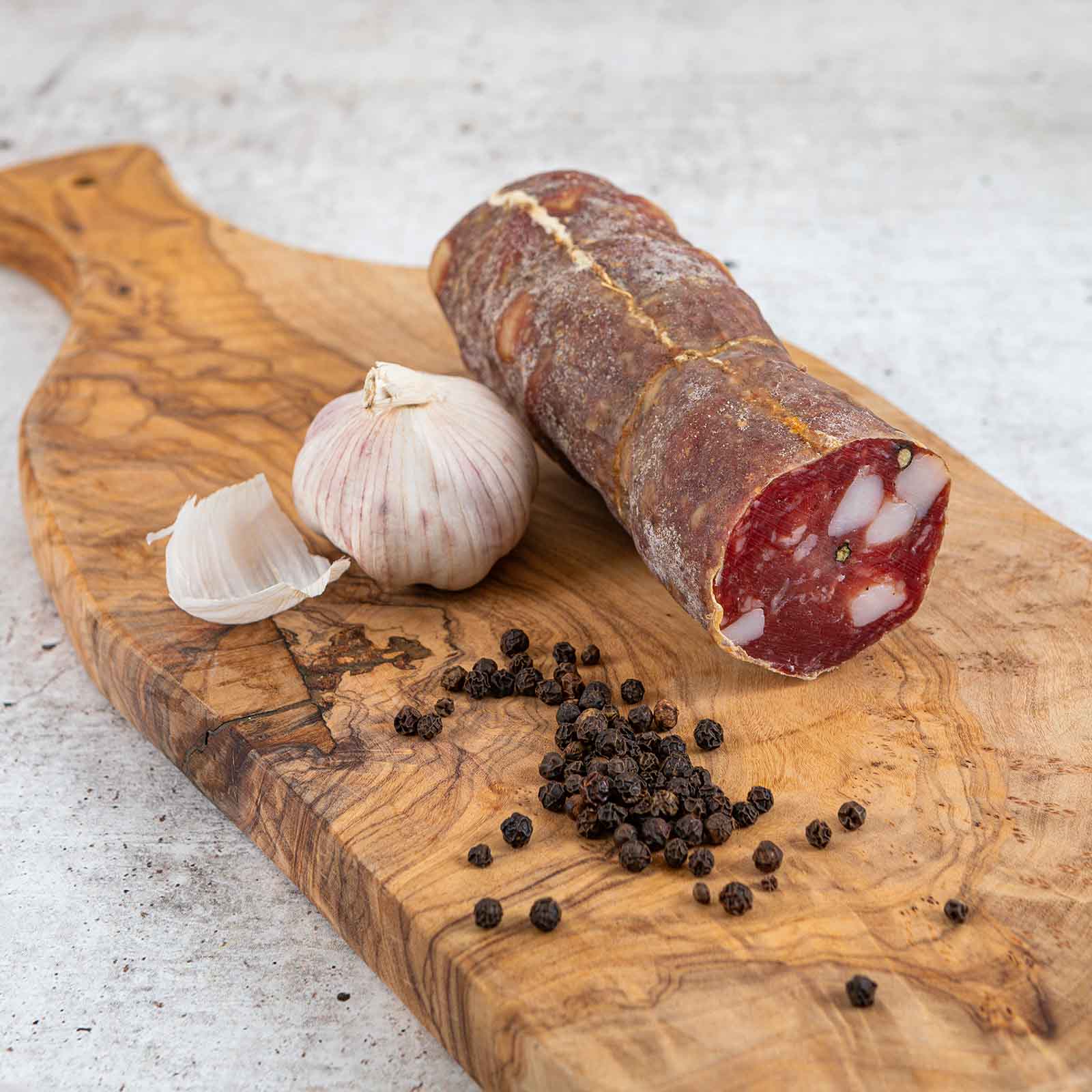 Our dried sausages take skill and knowledge to hand craft. Each one is carefully made using the right selection of meat and fats from our beautiful pigs. The spices are always chosen to enhance the flavour without masking the quality of the pork which is, of course, the most important ingredient.