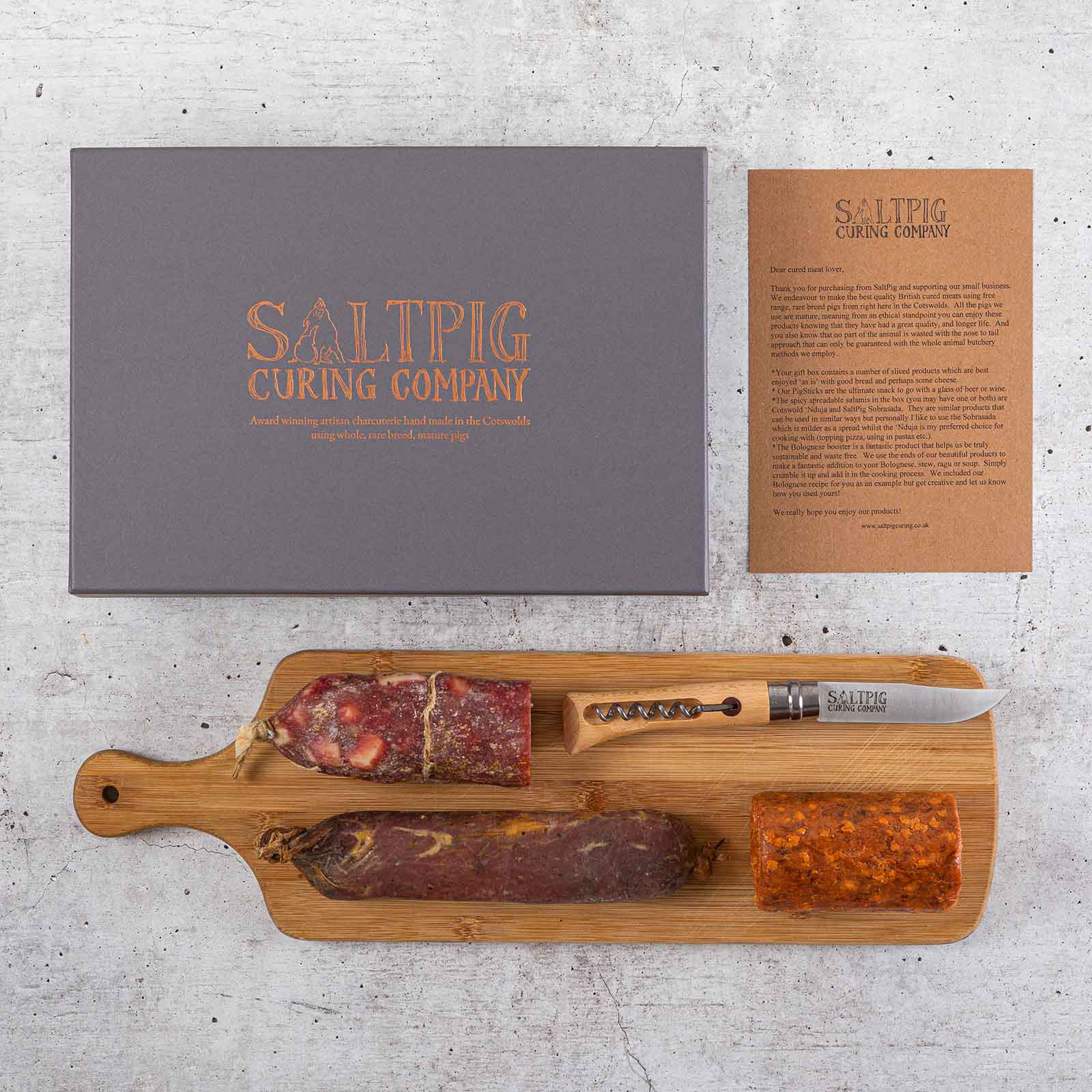 Our beautiful branded gift box is filled with large chunks of our most popular artisan charcuterie as well as a SaltPig branded Opinel corkscrew knife to picnic with!